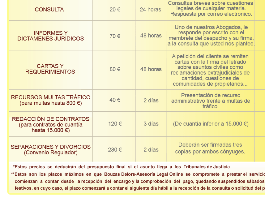 A continuación, aparece un listado con los servicios más usados. Para los demás solicítenos información sin compromiso, y le remitiremos un presupuesto con las condiciones. El precio de cualquier actuación se deducirá del presupuesto en caso de llegar a Juicio el asunto.